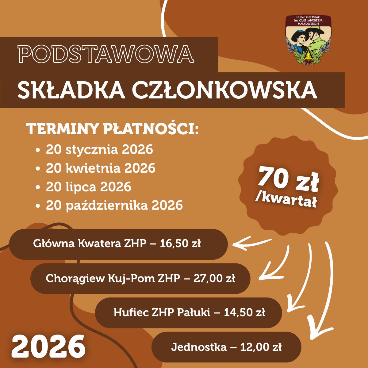 ❗️ wpłaty składki dokonujemy na konto wskazane przez drużynowego w nieprzekraczalnym terminie do 20 dnia pierwszego miesiąca kwartału;